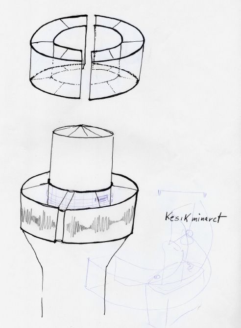 Konstruktionsskizze für die Installation am „Kesik Minaret“ | Bleistift, Tusche auf Papier | 2002