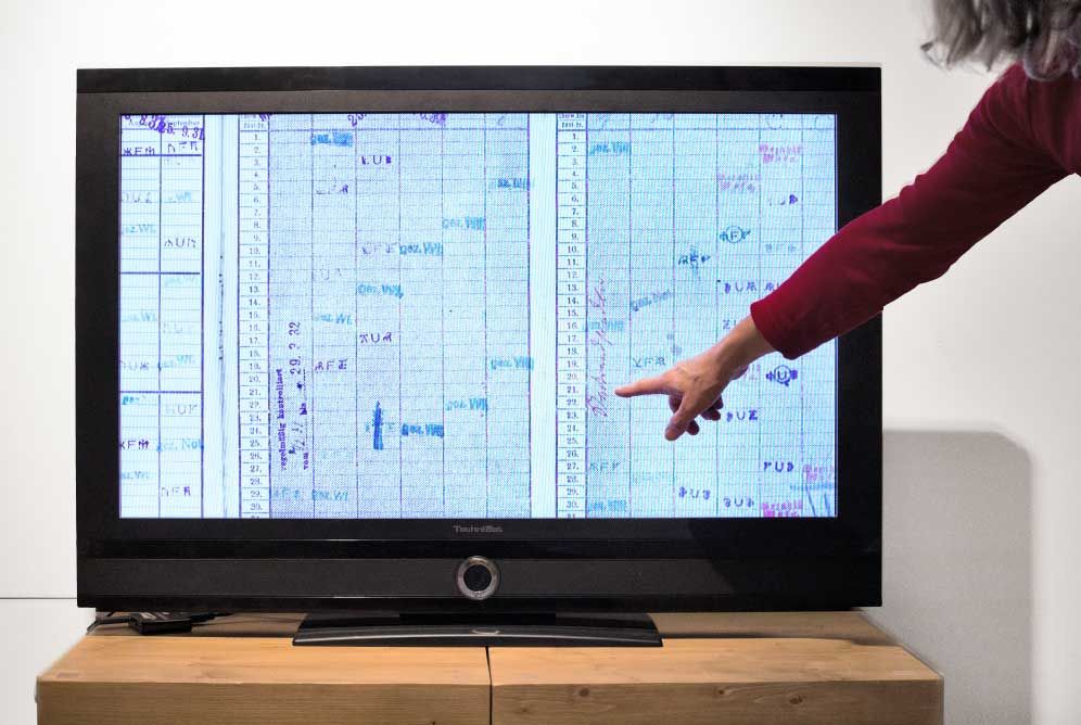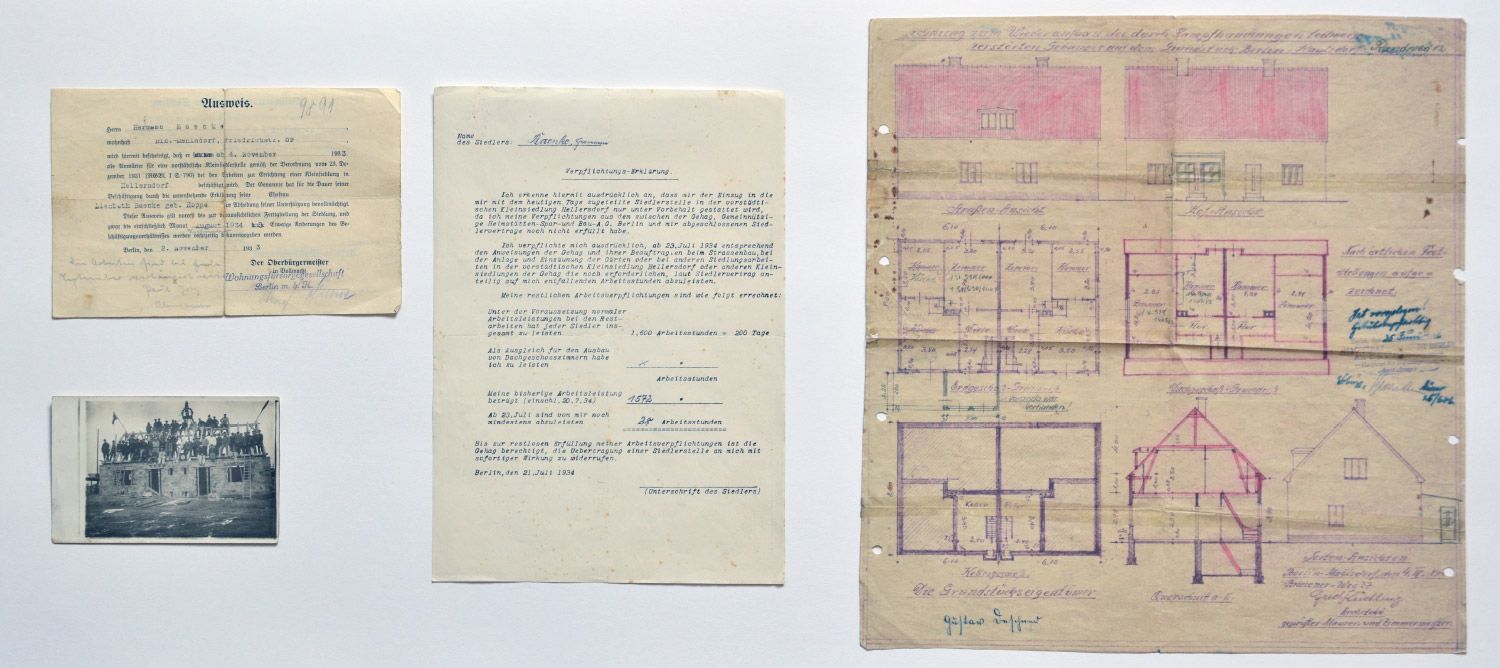 Den Eingang zur Video-Installation bilden sechs große Rahmen mit einer Auswahl historischer Dokumente, Leihgaben von Bewohner*innen aus den Siedlungen in Marzahn-Hellersdorf. Die Dokumente veranschaulichen die prekäre Situation der Arbeitslosen in den 1930er Jahren. Sie geben einen Einblick in das Programm und die Gründungsphase der Siedlungen am Ende der Weimarer Republik und dem Übergang zum Nationalsozialismus.