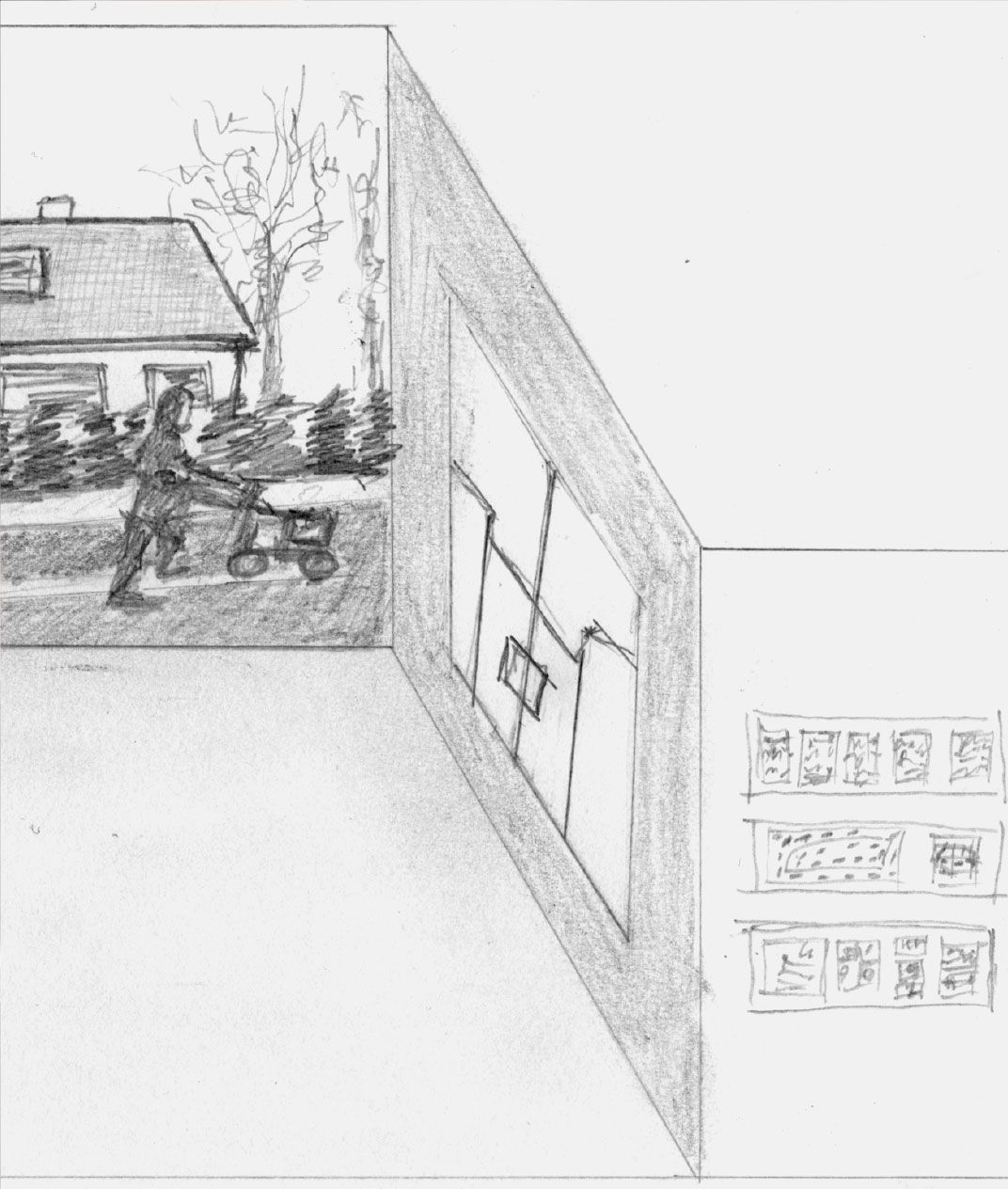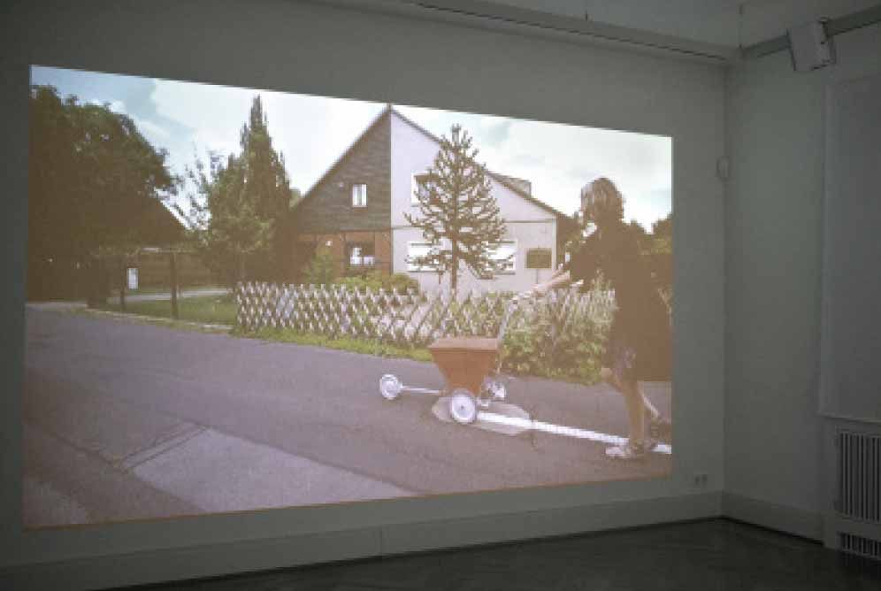 Im Bezirk Marzahn-Hellersdorf liegen fünf ehemalige Erwerbslosensiedlungen. Die Installation in der Ausstellung von Sigrun Drapatz und Tanja Lenuweit besteht aus vier Komponenten: zwei Video-Filme, eine Wandzeichnung und historische Dokumente.