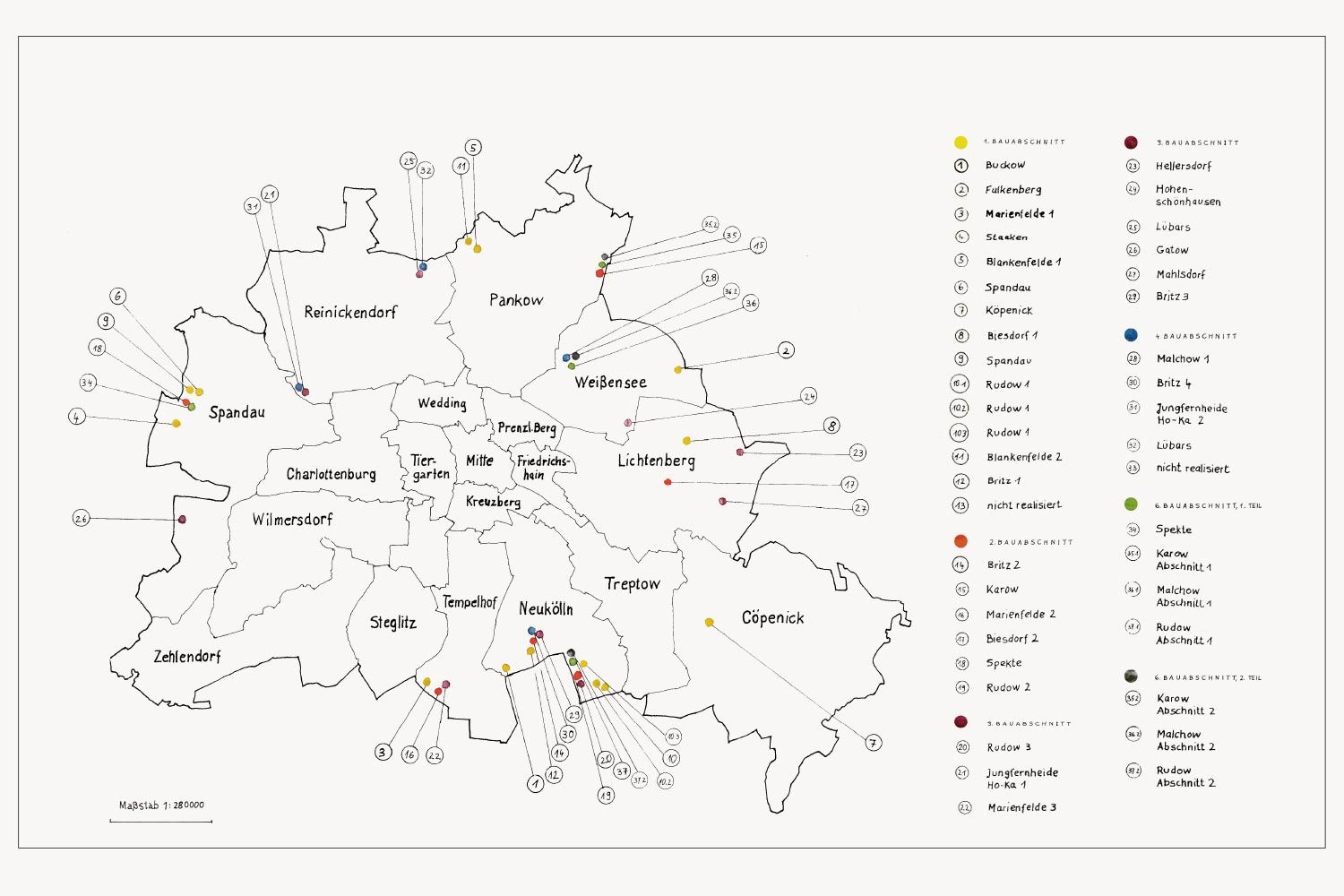 Karte von Groß-Berlin mit allen ehemaligen Erwerbslosen Siedlungen von 1932 bis 1940 | Tusche und Aquarell auf Transparentpapier | 60 x 34,5 cm | 2021