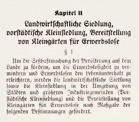 Am 6.10.1931 wurde in der III. Notverordnung ein „Kleinsiedlerprogramm für Erwerbslose“ auf Grundlage des „Reichsheimstättengesetzes“ verabschiedet. Am 10.11.1931 wurde die Umsetzung des Programms in die Verantwortung der Bundesländer gelegt und finanzielle Mittel in Höhe von 73 Millionen Reichsmark zur Verfügung gestellt.